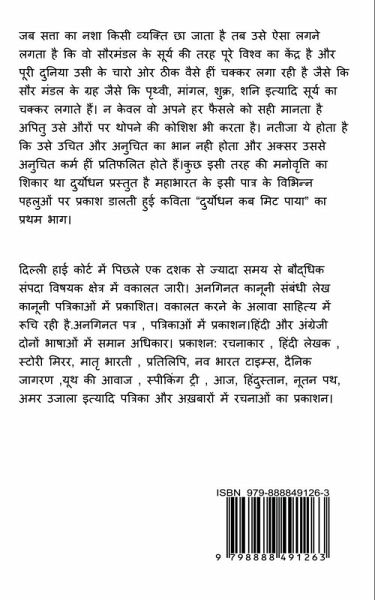When a person is intoxicated with power, then he starts feeling that he is the center of the whole world like the sun of the solar system and the whole world is revolving around him in the same way as the planets of the solar system like earth Mars, Venus, Saturn etc. revolve around the Sun. Not only does he consider his every decision right but also tries to impose it on others. The result is that he does not have a sense of right and wrong, and often only wrong deeds result from him. Duryodhana was the victim of some similar attitude. Presented is the first part of the poem "Duryodhana Kab Mit Paya", highlighting various aspects of this character of Mahabharata.