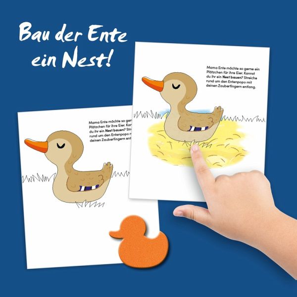 Das beigefügte Schwämmchen einfach nass machen, wieder in die dafür vorgesehene Wanne legen und los geht es: die kleinen Zauberfinger auf das Schwämmchen tupfen, nass machen und auf den Innenseiten loszaubern und malen. Kinder lieben die haptische Erfahrung und den direkten Einsatz ihrer Finger. Rund um die Welt der Tiere können Kinder interaktiv zu den spielerischen Aufgabenstellungen im Buch kreativ werden und den Tieren bei der einen oder anderen Herausforderung helfen. Rette die Katze vom Baum, hilf dem Hund beim Knochen ausgraben oder wuschel dem Löwen durch die Mähne. Nach dem Trocknen können die Bilder erneut bemalt werden - für unendlichen Malspaß!