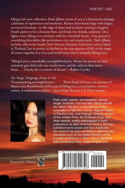 Mong-Lan's new collection, Dusk Aflame: poems & art, is a bittersweet melange, a delirium of experiences and memories. Buenos Aires looms large with elegiac, nocturnal footsteps: on the edge of chaos and accidents waiting to happen. Buenos Aires, womb and capital of the tango, a melancholic music and sultry dance created by men and women who felt a need for the embrace. Death aspires to be a character here, and Dusk, too, female, animistic. An elegy for all that exists only in memory. On a lighter note, Mong-Lan continues with her cherished theme--love poems to nourishing delectables, like persimmon, rice, and sesame seeds. Dusk Aflame includes odes to the South, New Orleans, Houston, Galveston, and an island in Thailand. Jazz in poetry, in rhythm to the syncopations of life, to the tango, all comes together in a voice and vision that is uniquely Mong-Lan's. Mong-Lan's virtuoso brush and ink paintings accompany her poems in a poetic dance of movement, providing a visual resonance and portent to her work.