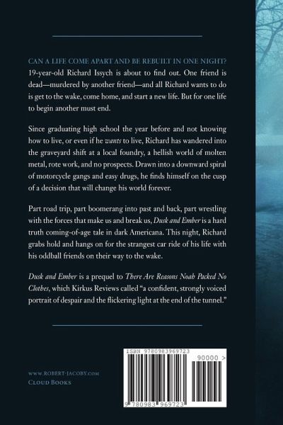 Can a life come apart and be rebuilt in one night? 19-year-old Richard Issych is about to find out. One friend is dead-murdered by another friend-and all Richard wants to do is get to the wake, come home, and start a new life. But for one life to begin another must end. Since graduating high school the year before and not knowing how to live, or even if he wants to live, Richard has wandered into the graveyard shift at a local foundry, a hellish world of molten metal, rote work, and no prospects. Drawn into a downward spiral of motorcycle gangs and easy drugs, he finds himself on the cusp of a decision that will change his world forever. Part road trip, part boomerang into past and back, part wrestling with the forces that make us and break us, Dusk and Ember is a hard truth coming-of-age tale in dark Americana. This night, Richard grabs hold and hangs on for the strangest car ride of his life with his oddball friends on their way to the wake. Dusk and Ember is a prequel to There Are Reasons Noah Packed No Clothes, which Kirkus Reviews called "a confident, strongly voiced portrait of despair and the flickering light at the end of the tunnel."