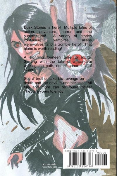 Dusk Stories is here! Multiple tales of action, adventure, horror and the supernatural! A variety of stories containing vampires, aliens werewolves, and a zombie hero! That alone is worth reading! A stunning fourteen tales to excite. Starting with the tale of a samurai walking the path, not of honor, but of blood. See a brother take his revenge on . . . death and the devil in another tale! All this and more can be found inside!