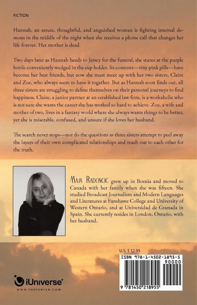 Hannah, an astute, thoughtful, and anguished woman is fighting internal demons in the middle of the night when she receives a phone call that changes her life forever. Her mother is dead. Two days later as Hannah heads to Jersey for the funeral, she stares at the purple bottle conveniently wedged in the cup holder. Its contents-tiny pink pills-have become her best friends, but now she must meet up with her two sisters, Claire and Zoe, who always seem to have it together. But as Hannah soon finds out, all three sisters are struggling to define themselves on their personal journeys to find happiness. Claire, a junior partner at an established law firm, is a workaholic who is not sure she wants the career she has worked so hard to achieve. Zoe, a wife and mother of two, lives in a fantasy world where she always wants things to be better, yet she is miserable, confused, and unsure if she loves her husband. The search never stops-nor do the questions as three sisters attempt to peel away the layers of their own complicated relationships and reach out to each other for the truth.
