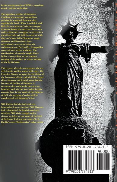 In the waning months of WWI, a cataclysm struck, and the world died. The legendary artifact of Solomon's Cauldron was unsealed, and millions perished in a magical firestorm that engulfed the Earth. When it collided with Hell, the two planes of existence merged. As cursed immortals, survivors face a new reality. Humanity struggles to survive in a world half infernal, half the ruins of a life they can't have, full of Daemons, magic, monsters, and Reveniens, those miraculously resurrected when the cauldron opened. For Lucifer, Armageddon came and went with a whimper. The machinations of mortals bought him a hollow victory. Bent on the complete merging of the realms, he seeks a method to win by his hand. Thirty years after the convergence, the war with Lucifer and his armies still rages. The Revenien Gideon, an agent for the Order of the Protectors of Life, and his Fallen Angel allies, Mastema and Ramiel, must find the lost text of the Key of Solomon. A document that could undo the curse on humanity and win the war, unless Lucifer succeeds first. In the hands of the Emperor of Hell, the merging of realms will be complete and seal humanity's fate. Will Gideon find the book and save humankind from extinction? Will Mastema find redemption? Or Ramiel mend past mistakes? Will their struggle end in victory or defeat at the hands of the Lord of Darkness? Pick up your copy of L. D. Hardin's novel 'Duskbreaker' today to find out.