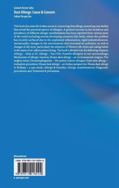 This book discusses the Indian scenario concerning dust allergy, presenting case studies that reveal the practical aspects of allergies. A gradual increase in the incidence and prevalence of different allergic manifestations has been reported from various parts of the world including several developing countries like India, where the problem has recently surfaced due to the unplanned urbanization, rapid industrialization, metamorphic changes in the environment, and increased air pollution, as well as changes in life style, particularly the adoption of Western life styles and eating habits in the name of so-called modern living. The book is divided into the following chapters: Allergy - what is it?, Allergy - Fact File; Possible allergens in our surroundings; Mechanism of allergic reaction; House dust allergy - an environmental enigma ; The mighty mites; Dermatophagoides - the potent indoor allergen ; Dust mite allergy - evaluation procedure; House dust allergy - an Indian perspective ;House dust allergy in Kolkata - a case study; Allergy & heredity; Allergic manifestations; Diagnostic procedures; and Treatment & prevention.