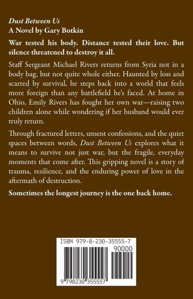 Dust Between Us A Novel by Gary Botkin War tested his body. Distance tested their love. But silence threatened to destroy it all. Staff Sergeant Michael Rivers returns from Syria not in a body bag, but not quite whole either. Haunted by loss and scarred by survival, he steps back into a world that feels more foreign than any battlefield he's faced. At home in Ohio, Emily Rivers has fought her own war-raising two children alone while wondering if her husband would ever truly return. Through fractured letters, unsent confessions, and the quiet spaces between words, Dust Between Us explores what it means to survive not just war, but the fragile, everyday moments that come after. This gripping novel is a story of trauma, resilience, and the enduring power of love in the aftermath of destruction. Sometimes the longest journey is the one back home.