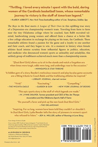"A thrilling, cinematic story. I loved every minute I spent with these bold, daring women whose remarkable journey is the stuff of American legend." -Karen Abbott, New York Times bestselling author of Liar, Temptress, Soldier, Spy The Boys in the Boat meets A League of Their Own in this true story of a Depression-era championship women's team. In the early 1930s, during the worst drought and financial depression in American history, Sam Babb began to dream. Like so many others, this charismatic Midwestern basketball coach wanted a reason to have hope. Traveling from farm to farm near the tiny Oklahoma college where he coached, Babb recruited talented, hardworking young women and offered them a chance at a better life: a free college education in exchange for playing on his basketball team, the Cardinals. Despite their fears of leaving home and the sacrifices that their families would face, the women joined the team. And as Babb coached the Cardinals, something extraordinary happened. These remarkable athletes found a passion for the game and a heartfelt loyalty to one another and their coach--and they began to win. Combining exhilarating sports writing and exceptional storytelling, Dust Bowl Girls takes readers on the Cardinals' intense, improbable journey all the way to an epic showdown with the prevailing national champions, helmed by the legendary Babe Didrikson. Lydia Reeder captures a moment in history when female athletes faced intense scrutiny from influential figures in politics, education, and medicine who denounced women's sports as unhealthy and unladylike. At a time when a struggling nation was hungry for inspiration, this unlikely group of trailblazers achieved much more than a championship season.