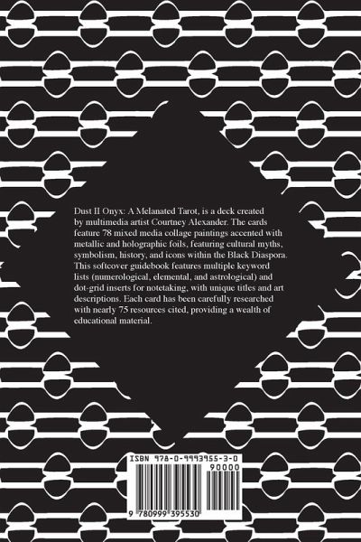 Dust II Onyx: A Melanated Tarot, is a deck created by multimedia artist Courtney Alexander. The cards feature 78 mixed media collage paintings accented with metallic and holographic foils, featuring cultural myths, symbolism, history, and icons within the Black Diaspora. This softcover guidebook features multiple keyword lists (numerological, elemental, and astrological) and dot-grid inserts for notetaking, with unique titles and art descriptions. Each card has been carefully researched with nearly 75 resources cited, providing a wealth of educational material.