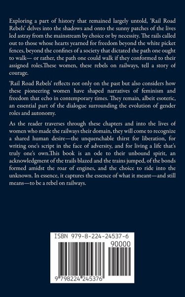 Exploring a part of history that remained largely untold, 'Rail Road Rebels' delves into the shadows and onto the sunny patches of the lives led astray from the mainstream by choice or by necessity. The rails called out to those whose hearts yearned for freedom beyond the white picket fences, beyond the confines of a society that dictated the path one ought to walk- or rather, the path one could walk if they conformed to their assigned roles.These women, these rebels on railways, tell a story of courage. 'Rail Road Rebels' reflects not only on the past but also considers how these pioneering women have shaped narratives of feminism and freedom that echo in contemporary times. They remain, albeit esoteric, an essential part of the dialogue surrounding the evolution of gender roles and autonomy. As the reader traverses through these chapters and into the lives of women who made the railways their domain, they will come to recognize a shared human desire-the unquenchable thirst for liberation, for writing one's script in the face of adversity, and for living a life that's truly one's own.This book is an ode to their unbound spirit, an acknowledgment of the trails blazed and the trains jumped, of the bonds formed amidst the roar of engines, and the choice to ride into the unknown. In essence, it captures the essence of what it meant-and still means-to be a rebel on railways.