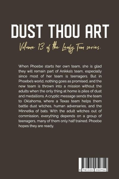 Volume 13 of the Leafy Tom Series. When Phoebe starts her own team, she is glad they will remain part of Anikka's team; most of her team is teenagers, and only partially trained. In Phoebe's world, nothing goes as promised. Her new team is thrown into a mission without the adults when the adults are missing and the only thing at home is piles of dust and medallions. A cryptic message sends the team to Oklahoma, where they join forces with a Texas team to try to bring the witches back home. They face dust witches, humans, and the Minnetka of bats. Everything depends on a team of half-trained teenagers; Phoebe hopes they are ready.