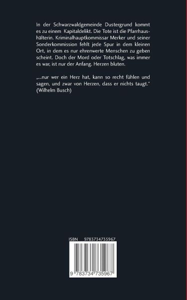 In der Schwarzwaldgemeinde Dustergrund kommt es zu einem Kapitaldelikt. Die Tote ist die Pfarrhaushälterin. Kriminalhauptkommissar Merker und seiner Sonderkommission fehlt jede Spur in dem kleinen Ort, in dem es nur ehrenwerte Menschen zu geben scheint. Doch der Mord oder Totschlag, was immer es war, ist nur der Anfang. Herzen bluten....nur wer ein Herz hat, kann so recht fühlen und sagen, und zwar von Herzen, dass er nichts taugt.(Wilhelm Busch)