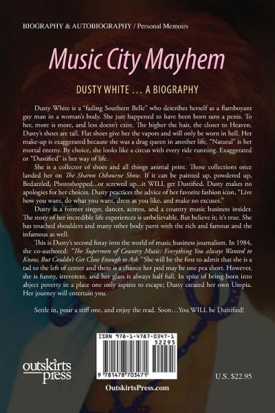 "Dustified: Tall Tales From A Tired Old Trollop", is a rollicking journey through the true-life story of a music business insider. It is a personal journey through one of the most interesting lives you'll ever share. "Dustified" is a laugh out loud tome of the life of Dusty White, the self-appointed Queen of Everything. She has hilariously survived nearly every situation a girl who arose from abject poverty into the limelight of many famous people, can possibly 'endure'. You will laugh as she creates her own utopia. Haven't you always wondered what it is like to be an entertainment insider? What it's like to travel the country with the rich and famous? Now, you can travel this journey, first hand. Dusty manages steady control over situations that most people only dream they could tackle. Others will be grateful they never had any such dreams. Everyone who reads her uproarious chronicles will be entertained. She is fond of saying she's been everywhere, "from the outhouse to the White House." Follow her journey as a small town girl from backwoods Tennessee, to the bright lights of Nashville-Music City USA. Enjoy her fearless, jovial escapades as a tiny little girl with the mouth of a sailor, to a grown-up, flame-haired siren, determined to rule the world. Her multiple marriages, stints as a singer, dancer, actress and general rebel, are pricelessly told in her sparkling style. Her roles as a music business professional with one of the largest music publishers in the world, then with one of the most famous radio stations on the planet and finally with one of the primo music trade magazines in the world, will offer up many titillating tales of Music City Mayhem. According to all who know her, anything that is unnatural looking, bizarre and off-kilter, has probably been "Dustified." Dusty feels she is a drag queen at heart; a flamboyant gay man in a woman's body. She is just automatically drawn to anything that glitters, animal print EVERYTHING and 6" tall pumps. She considers flat a mortal sin. No flat hair, flat boobs or flat shoes for her. Flat shoes give her the vapors and will only be worn in hell! An encounter with Dusty will never be forgotten. Dusty is someone you will really want to know and "Dustified" is something you'll want to share with you friends. From the very first sentence to the last, you will be solidly entertained, laughing all the way. Let's just say that Dusty will never go down in the annals of time as a canon of good behavior. But, her joie de vivre at simply being alive, and doing so HER WAY, is unrivaled. You will leave this journey wanting to be "Dustified!" Dusty recounts her life and loves as she strove to fulfill her lifelong dream of being an entertainer. Along the way, she rubbed elbows and many other body parts with the rich and famous, as well as some of the infamous. Her colorful way of telling her story will transport you into the world of music, movies and glamour. It will also transport you into another realm as she talks about her family's role in helping hide out one of the FBI's 10 Most Wanted for several years. Dusty describes herself as a fading Southern Belle who admits she is a tad to the left of center, and her pod may be a pea or two short! She thinks she may be the illegitimate daughter of Betty White (albeit a slightly "trampier" version). She is funny, irreverent and she WILL entertain you. Settle in, pour a stiff one and enjoy...soon you too will be "Dustified!"