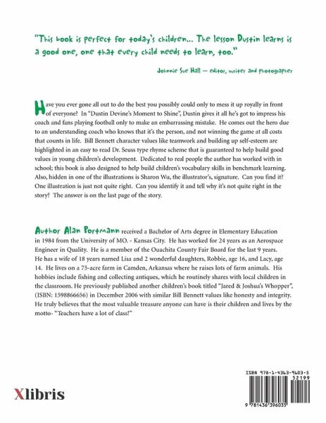 Have you ever gone all out to do the best you possibly could only to mess it up royally in front of everyone? In "Dustin Devine's Moment to Shine", Dustin gives it all he's got to impress his coach and fans playing football only to make an embarrassing mistake. He comes out the hero due to an understanding coach who knows that it's the person, and not winning the game at all costs that counts in life. Bill Bennett character values like teamwork and building up self-esteem are highlighted in an easy to read Dr. Seuss type rhyme scheme that is guaranteed to help build good values in young children's development. Dedicated to real people the author has worked with in school; this book is also designed to help build children's vocabulary skills in benchmark learning. Also, hidden in one of the illustrations is Sharon Wu, the illustrator's, signature. Can you find it? One illustration is just not quite right. Can you identify it and tell why it's not quite right in the story? The answer is on the last page of the story.