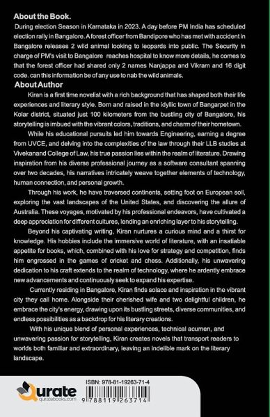 "Kiran is a first time novelist with a rich background that has shaped both their life experiences and literary style. Born and raised in the idyllic town of Bangarpet in the Kolar district, situated just 100 kilometers from the bustling city of Bangalore, his storytelling is imbued with the vibrant colors, traditions, and charm of their hometown. While his educational pursuits led him towards Engineering, earning a degree from UVCE, and delving into the complexities of the law through their LLB studies at Vivekanand College of Law, his true passion lies within the realm of literature. Drawing inspiration from his diverse professional journey as a software consultant spanning over two decades, his narratives intricately weave together elements of technology, human connection, and personal growth. Through his work, he have traversed continents, setting foot on European soil, exploring the vast landscapes of the United States, and discovering the allure of Australia. These voyages, motivated by his professional endeavors, have cultivated a deep appreciation for different cultures, lending an enriching layer to his storytelling. Beyond his captivating writing, Kiran nurtures a curious mind and a thirst for knowledge. His hobbies include the immersive world of literature, with an insatiable appetite for books, which, combined with his love for strategy and competition, finds him engrossed in the games of cricket and chess. Additionally, his unwavering dedication to his craft extends to the realm of technology, where he ardently embrace new advancements and continuously seek to expand his expertise. Currently residing in Bangalore, Kiran finds solace and inspiration in the vibrant city they call home. Alongside their cherished wife and two delightful children, he embrace the city's energy, drawing upon its bustling streets, diverse communities, and endless possibilities as a backdrop for his literary creations. With his unique blend of personal experiences, technical acumen, and unwavering passion for storytelling, Kiran creates novels that transport readers to worlds both familiar and extraordinary, leaving an indelible mark on the literary landscape."