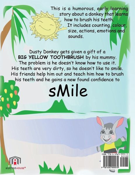 This is a humorous, early learning story about a donkey that learns how to brush his teeth. It includes counting, colour, size, actions, emotions and sounds. Dusty Donkey gets given a gift of a BIG YELLOW TOOTHBRUSH by his mummy. The problem is he doesn't know how to use it. His teeth are very dirty, so he doesn't like to smile. His friends help him out and teach him how to brush his teeth and he gains a new found confidence to smile