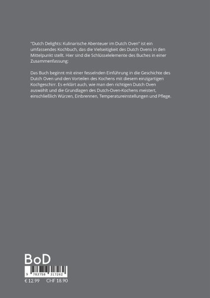 "Dutch Delights: Kulinarische Abenteuer im Dutch Oven" ist ein umfassendes Kochbuch, das die Vielseitigkeit des Dutch Ovens in den Mittelpunkt stellt. Hier sind die Schlüsselelemente des Buches in einer Zusammenfassung:Das Buch beginnt mit einer fesselnden Einführung in die Geschichte des Dutch Oven und den Vorteilen des Kochens mit diesem einzigartigen Kochgeschirr. Es erklärt auch, wie man den richtigen Dutch Oven auswählt und die Grundlagen des Dutch-Oven-Kochens meistert, einschließlich Würzen, Einbrennen, Temperatureinstellungen und Pflege.Es gliedert sich in verschiedene Kapitel, die eine breite Palette von Rezepten abdecken. Von herzhaften Suppen und Eintöpfen über Schmorgerichte und Braten bis hin zu Pasta, Fisch, Beilagen, Brot, Desserts und internationalen Gerichten. Das Buch bietet eine umfassende Sammlung von Dutch-Oven-Rezepten.Einige Highlights des Buches sind zum Beispiel Rezepte wie "Zarter Rinderbraten mit Rotweinsoße", "Gegrillte Garnelen in Knoblauchbutter", "Vegetarische Linsenmoussaka" und "Schokoladenkuchen mit flüssigem Kern." Das Kapitel über internationale Dutch-Oven-Küche führt Leser auf eine kulinarische Weltreise mit Rezepten wie "Coq au Vin" aus Frankreich, einem "Pastrami-Sandwich mit Sauerkraut" aus den USA und "Spanischem Reis mit Chorizo" aus Spanien.Zusätzlich gibt das Buch wertvolle Tipps und Tricks für ein optimales Dutch-Oven-Erlebnis, sei es beim Kochen im Freien oder in der Küche. Es schließt mit kreativen Variationen, eigenen Rezeptentwicklungstipps und einer Liste unverzichtbarer Dutch-Oven-Utensilien."Dutch Delights" ist nicht nur ein Kochbuch, sondern ein inspirierender Leitfaden für alle, die die Magie des Dutch-Oven-Kochens entdecken und kulinarische Abenteuer erleben möchten.