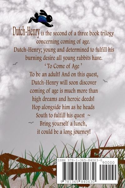 Dutch-Henry is the second of a three book trilogy concerning coming of age. Dutch-Henry; young and determined to fulfill his burning desire all young rabbits have. 'To Come of Age' ~ to be an adult! And on this quest, Dutch-Henry will soon discover coming of age is much more than high dreams and heroic deeds! Hop alongside him as he heads South to fulfill his quest ~ Bring yourself a lunch; it could be a long journey!