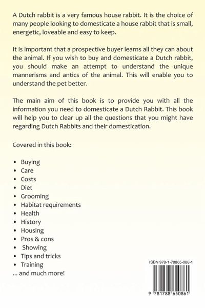 Dutch rabbits A Dutch rabbit is a very famous house rabbit. It is the choice of many people looking to domesticate a house rabbit that is small, energetic, loveable and easy to keep. It is important that a prospective buyer learns all they can about the animal. If you wish to buy and domesticate a Dutch rabbit, you should make an attempt to understand the unique mannerisms and antics of the animal. This will enable you to understand the pet better. The main aim of this book is to provide you with all the information you need to domesticate a Dutch Rabbit. This book will help you to clear up all the questions that you might have regarding Dutch Rabbits and their domestication. Covered in this book: - Buying - Care - Costs - Diet - Grooming - Habitat requirements - Health - History - Housing - Pros & cons - Showing - Tips and tricks - Training ... and much more!