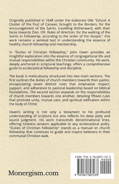 Originally published in 1648 under the elaborate title "Eshcol: A Cluster of the fruit of Canaan; brought to the Borders, for the encouragement of the Saints, travelling thitherward, with their faces towards Zion. OR. Rules of direction, for the walking of the Saints in Fellowship, according to the order of the Gospel," this work remains a seminal text in understanding the essence of healthy church fellowship and membership. In "Duties of Christian Fellowship," John Owen provides an insightful exploration into the essence of congregational life and mutual responsibilities within the Christian community. His work, deeply anchored in scriptural teachings, offers a comprehensive guide to ecclesiastical fellowship and discipline. The book is meticulously structured into two main sections. The first outlines the duties of church members towards their pastor, encapsulating seven distinct rules that emphasize respect, support, and adherence to pastoral leadership based on biblical foundations. The second section expands on the responsibilities of church members towards one another, detailing fifteen rules that promote unity, mutual care, and spiritual edification within the body of Christ. Owen's writing is not only a testament to his profound understanding of scripture but also reflects his deep piety and sound judgment. His work transcends denominational lines, offering timeless wisdom applicable to any ecclesiastical polity. "Duties of Christian Fellowship" stands as a manual on church fellowship that continues to guide and inspire believers in their communal Christian walk.