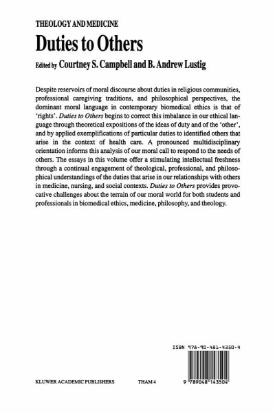 Despite reservoirs of moral discourse about duties in religious communities, professional caregiving traditions, and philosophical perspectives, the dominant moral language in contemporary biomedical ethics is that of `rights'. Duties to Others begins to correct this imbalance in our ethical language through theoretical expositions of the ideas of duty and of the `other', and by applied exemplifications of particular duties to identified others that arise in the context of health care. A pronounced multidisciplinary orientation informs this analysis of our moral call to respond to the needs of others. The essays in this volume offer a stimulating intellectual freshness through a continual engagement of theological, professional, and philosophical understandings of the duties that arise in our relationships with others in medicine, nursing, and social contexts. Duties to Others provides provocative challenges about the terrain of our moral world for both students and professionals in biomedical ethics, medicine, philosophy, and theology.