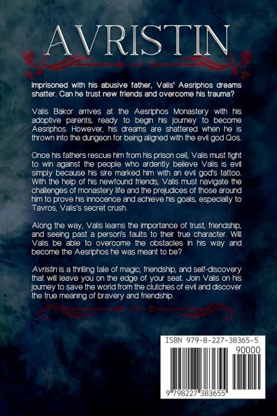 Imprisoned with his abusive father, Valis' Aesriphos dreams shatter. Can he trust new friends and overcome his trauma? Valis Bakor arrives at the Aesriphos Monastery with his adoptive parents, ready to begin his journey to become Aesriphos. However, his dreams are shattered when he is thrown into the dungeon for being aligned with the evil god Qos. Once his fathers rescue him from his prison cell, Valis must fight to win against the people who ardently believe Valis is evil simply because his sire marked him with an evil god's tattoo. With the help of his newfound friends, Valis must navigate the challenges of monastery life and the prejudices of those around him to prove his innocence and achieve his goals, especially to Tavros, Valis's secret crush. Along the way, Valis learns the importance of trust, friendship, and seeing past a person's faults to their true character. Will Valis be able to overcome the obstacles in his way and become the Aesriphos he was meant to be? Avristin is a thrilling tale of magic, friendship, and self-discovery that will leave you on the edge of your seat. Join Valis on his journey to save the world from the clutches of evil and discover the true meaning of bravery and friendship. Tags:Totally not Valis' fault he has tainted magic, but it causes problems anyway, crush gone wrong, it's a hot mess but they're trying dammit, Tavros use your brain challenge: failed, don't worry Tavros eventually buys a clue, Valis protection squad assemble!, Enigmatic librarian/historian is enigmatic, Valis needs cuddles, Aryn thinks this is adorkable and gives Valis all the cuddles even though Valis accidentally beats him up, Valis is timid and kind, he's also ruthless if his back is to a wall, Aryn adopts Valis like a puppy, well really everyone adopts him as a puppy, social anxiety makes things hard, why is Valis constantly naked?, where'd the dads go?, Valis murders again, oops