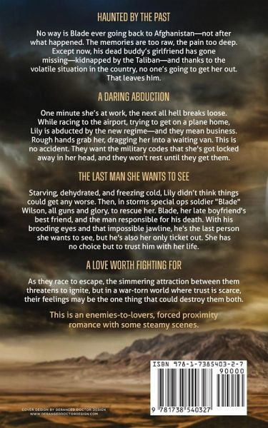 HAUNTED BY THE PAST No way is Blade ever going back to Afghanistan-not after what happened. The memories are too raw, the pain too deep. Except now, his dead buddy's girlfriend has gone missing-kidnapped by the Taliban-and thanks to the volatile situation in the country, no one's going to get her out. That leaves him. A DARING ABDUCTION One minute she's at work, the next all hell breaks loose. While racing to the airport, trying to get on a plane home, Lily is abducted by the new regime-and they mean business. Rough hands grab her, dragging her into a waiting van. This is no accident. They want the military codes that she's got locked away in her head, and they won't rest until they get them. THE LAST MAN SHE WANTS TO SEE Starving, dehydrated, and freezing cold, Lily didn't think things could get any worse. Then, in storms special ops soldier "Blade" Wilson, all guns and glory, to rescue her. Blade, her late boyfriend's best friend, and the man responsible for his death. With his brooding eyes and that impossible jawline, he's the last person she wants to see, but he's also her only ticket out. She has no choice but to trust him with her life. A LOVE WORTH FIGHTING FOR As they race to escape, the simmering attraction between them threatens to ignite, but in a war-torn world where trust is scarce, their feelings may be the one thing that could destroy them both. This is an enemies-to-lovers, forced proximity romance with some steamy scenes.