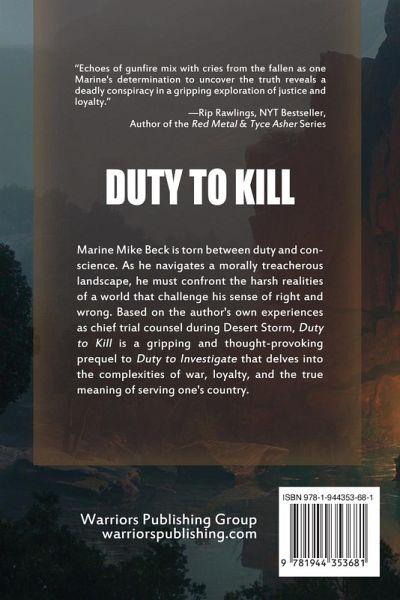 Marine Mike Beck is torn between duty and conscience. As he navigates a morally treacherous landscape, he must confront the harsh realities of a world that challenge his sense of right and wrong. Based on the author's own experiences as chief trial counsel during Desert Storm, Duty to Kill is a gripping and thought-provoking prequel to Duty to Investigate that delves into the complexities of war, loyalty, and the true meaning of serving one's country.
