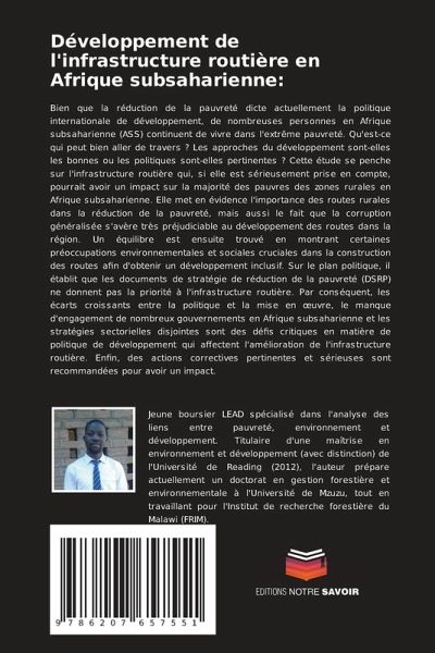Bien que la réduction de la pauvreté dicte actuellement la politique internationale de développement, de nombreuses personnes en Afrique subsaharienne (ASS) continuent de vivre dans l'extrême pauvreté. Qu'est-ce qui peut bien aller de travers ? Les approches du développement sont-elles les bonnes ou les politiques sont-elles pertinentes ? Cette étude se penche sur l'infrastructure routière qui, si elle est sérieusement prise en compte, pourrait avoir un impact sur la majorité des pauvres des zones rurales en Afrique subsaharienne. Elle met en évidence l'importance des routes rurales dans la réduction de la pauvreté, mais aussi le fait que la corruption généralisée s'avère très préjudiciable au développement des routes dans la région. Un équilibre est ensuite trouvé en montrant certaines préoccupations environnementales et sociales cruciales dans la construction des routes afin d'obtenir un développement inclusif. Sur le plan politique, il établit que les documents de stratégie de réduction de la pauvreté (DSRP) ne donnent pas la priorité à l'infrastructure routière. Par conséquent, les écarts croissants entre la politique et la mise en oeuvre, le manque d'engagement de nombreux gouvernements en Afrique subsaharienne et les stratégies sectorielles disjointes sont des défis critiques en matière de politique de développement qui affectent l'amélioration de l'infrastructure routière. Enfin, des actions correctives pertinentes et sérieuses sont recommandées pour avoir un impact.