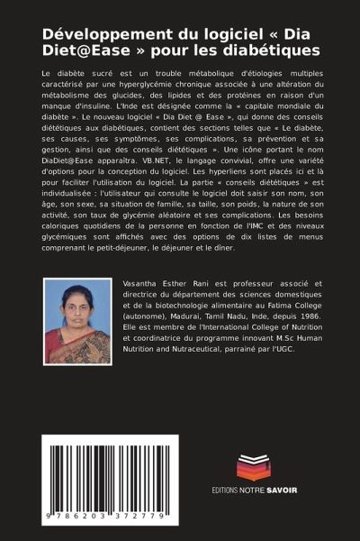Le diabète sucré est un trouble métabolique d'étiologies multiples caractérisé par une hyperglycémie chronique associée à une altération du métabolisme des glucides, des lipides et des protéines en raison d'un manque d'insuline. L'Inde est désignée comme la « capitale mondiale du diabète ». Le nouveau logiciel « Dia Diet @ Ease », qui donne des conseils diététiques aux diabétiques, contient des sections telles que « Le diabète, ses causes, ses symptômes, ses complications, sa prévention et sa gestion, ainsi que des conseils diététiques ». Une icône portant le nom DiaDiet@Ease apparaîtra. VB.NET, le langage convivial, offre une variété d'options pour la conception du logiciel. Les hyperliens sont placés ici et là pour faciliter l'utilisation du logiciel. La partie « conseils diététiques » est individualisée : l'utilisateur qui consulte le logiciel doit saisir son nom, son âge, son sexe, sa situation de famille, sa taille, son poids, la nature de son activité, son taux de glycémie aléatoire et ses complications. Les besoins caloriques quotidiens de la personne en fonction de l'IMC et des niveaux glycémiques sont affichés avec des options de dix listes de menus comprenant le petit-déjeuner, le déjeuner et le dîner.