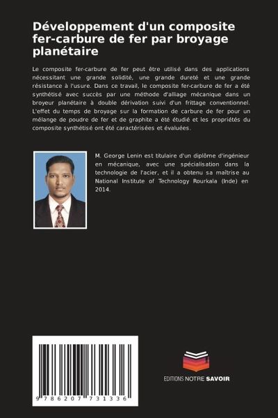 Le composite fer-carbure de fer peut être utilisé dans des applications nécessitant une grande solidité, une grande dureté et une grande résistance à l'usure. Dans ce travail, le composite fer-carbure de fer a été synthétisé avec succès par une méthode d'alliage mécanique dans un broyeur planétaire à double dérivation suivi d'un frittage conventionnel. L'effet du temps de broyage sur la formation de carbure de fer pour un mélange de poudre de fer et de graphite a été étudié et les propriétés du composite synthétisé ont été caractérisées et évaluées.