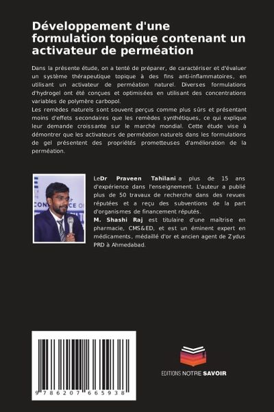 Dans la présente étude, on a tenté de préparer, de caractériser et d'évaluer un système thérapeutique topique à des fins anti-inflammatoires, en utilisant un activateur de perméation naturel. Diverses formulations d'hydrogel ont été conçues et optimisées en utilisant des concentrations variables de polymère carbopol.Les remèdes naturels sont souvent perçus comme plus sûrs et présentant moins d'effets secondaires que les remèdes synthétiques, ce qui explique leur demande croissante sur le marché mondial. Cette étude vise à démontrer que les activateurs de perméation naturels dans les formulations de gel présentent des propriétés prometteuses d'amélioration de la perméation.