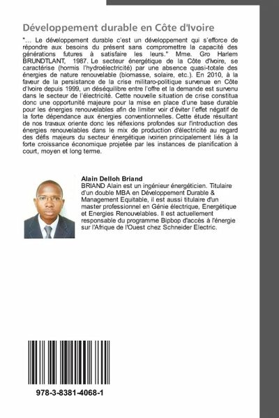 " Le développement durable c est un développement qui s efforce de répondre aux besoins du présent sans compromettre la capacité des générations futures à satisfaire les leurs." Mme. Gro Harlem BRUNDTLANT, 1987. Le secteur énergétique de la Côte d'Ivoire, se caractérise (hormis l hydroélectricité) par une absence quasi-totale des énergies de nature renouvelable (biomasse, solaire, etc.). En 2010, à la faveur de la persistance de la crise militaro-politique survenue en Côte d Ivoire depuis 1999, un déséquilibre entre l offre et la demande est survenu dans le secteur de l électricité. Cette nouvelle situation de crise constitua donc une opportunité majeure pour la mise en place d une base durable pour les énergies renouvelables afin de limiter voir d éviter l effet négatif de la forte dépendance aux énergies conventionnelles. Cette étude résultant de nos travaux oriente donc les réflexions profondes sur l'introduction des énergies renouvelables dans le mix de production d'électricité au regard des défis majeurs du secteur énergétique ivoirien principalement liés à la forte croissance économique projetée par les instances de planification à court, moyen et long terme.