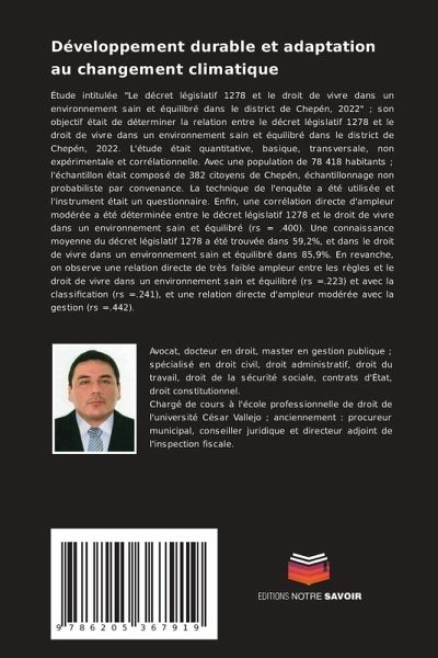 Étude intitulée "Le décret législatif 1278 et le droit de vivre dans un environnement sain et équilibré dans le district de Chepén, 2022" ; son objectif était de déterminer la relation entre le décret législatif 1278 et le droit de vivre dans un environnement sain et équilibré dans le district de Chepén, 2022. L'étude était quantitative, basique, transversale, non expérimentale et corrélationnelle. Avec une population de 78 418 habitants ; l'échantillon était composé de 382 citoyens de Chepén, échantillonnage non probabiliste par convenance. La technique de l'enquête a été utilisée et l'instrument était un questionnaire. Enfin, une corrélation directe d'ampleur modérée a été déterminée entre le décret législatif 1278 et le droit de vivre dans un environnement sain et équilibré (rs = .400). Une connaissance moyenne du décret législatif 1278 a été trouvée dans 59,2%, et dans le droit de vivre dans un environnement sain et équilibré dans 85,9%. En revanche, on observe une relation directe de très faible ampleur entre les règles et le droit de vivre dans un environnement sain et équilibré (rs =.223) et avec la classification (rs =.241), et une relation directe d'ampleur modérée avec la gestion (rs =.442).