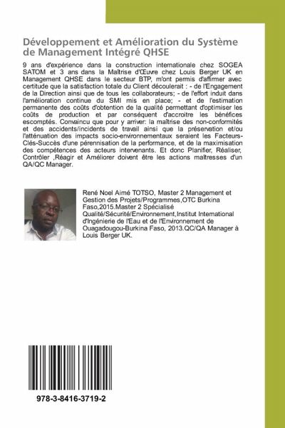 9 ans d'expérience dans la construction internationale chez SOGEA SATOM et 3 ans dans la Maîtrise d' uvre chez Louis Berger UK en Management QHSE dans le secteur BTP, m'ont permis d'affirmer avec certitude que la satisfaction totale du Client découlerait : - de l'Engagement de la Direction ainsi que de tous les collaborateurs; - de l'effort induit dans l'amélioration continue du SMI mis en place; - et de l'estimation permanente des coûts d'obtention de la qualité permettant d'optimiser les coûts de production et par conséquent d'accroitre les bénéfices escomptés. Convaincu que pour y arriver: la maîtrise des non-conformités et des accidents/incidents de travail ainsi que la préservation et/ou l'atténuation des impacts socio-environnementaux seraient les Facteurs-Clés-Succès d'une pérennisation de la performance, et de la maximisation des compétences des acteurs intervenants. Et donc Planifier, Réaliser, Contrôler ,Réagir et Améliorer doivent être les actions maîtresses d'un QA/QCManager.