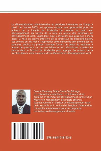 La décentralisation administrative et politique intervenue au Congo à partir de l année 2003, est apparue comme une opportunité pour les acteurs de la localité de Kindamba de prendre en main leur développement, au travers de la mise en uvre des initiatives de développement local. Cependant, nous constatons que plusieurs années après la mise en uvre effective de ce processus de décentralisation, ces acteurs ont du mal à s approprier cette démarche tant prônée par les pouvoirs publics. Le présent ouvrage fournit un début de réponses à autant de questions sur les procédures et les mécanismes à mettre en uvre dans le District de Kindamba pour appuyer les acteurs de la localité dans la mise en uvre de la démarche de développement local.