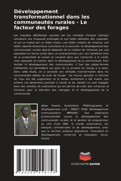 Les maladies débilitantes causées par les maladies d'origine hydrique entraînent une incapacité prolongée et une faible utilisation des capacités, ce qui se traduit par un faible revenu, une faible création de richesse, une faible capacité économique cumulative et la pauvreté. Le développement des communautés rurales devrait dépendre de la création de richesses par une population en bonne santé dans un environnement sain. Les bénéfices tirés de la productivité du travail ne seraient alors pas consacrés à la santé, mais épargnés et investis dans le développement de la communauté. Pour faciliter le développement des communautés, il faut des plates-formes habilitantes qui permettent aux gens de se prendre en charge à la base. Dans cette étude, on a constaté une véritable transformation dans les communautés dotées de puits de forage : les heures passées à chercher de l'eau ont été supprimées et le temps économisé a été investi. Les enfants ont pleinement participé à l'école et les adultes se sont engagés dans des activités de subsistance qui ont permis de créer des richesses et d'investir pour le bien-être des ménages et le développement de la communauté.