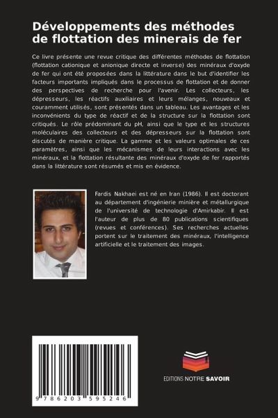 Ce livre présente une revue critique des différentes méthodes de flottation (flottation cationique et anionique directe et inverse) des minéraux d'oxyde de fer qui ont été proposées dans la littérature dans le but d'identifier les facteurs importants impliqués dans le processus de flottation et de donner des perspectives de recherche pour l'avenir. Les collecteurs, les dépresseurs, les réactifs auxiliaires et leurs mélanges, nouveaux et couramment utilisés, sont présentés dans un tableau. Les avantages et les inconvénients du type de réactif et de la structure sur la flottation sont critiqués. Le rôle prédominant du pH, ainsi que le type et les structures moléculaires des collecteurs et des dépresseurs sur la flottation sont discutés de manière critique. La gamme et les valeurs optimales de ces paramètres, ainsi que les mécanismes de leurs interactions avec les minéraux, et la flottation résultante des minéraux d'oxyde de fer rapportés dans la littérature sont résumés et mis en évidence.