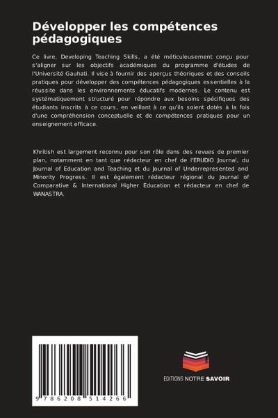 Ce livre, Developing Teaching Skills, a été méticuleusement conçu pour s'aligner sur les objectifs académiques du programme d'études de l'Université Gauhati. Il vise à fournir des aperçus théoriques et des conseils pratiques pour développer des compétences pédagogiques essentielles à la réussite dans les environnements éducatifs modernes. Le contenu est systématiquement structuré pour répondre aux besoins spécifiques des étudiants inscrits à ce cours, en veillant à ce qu'ils soient dotés à la fois d'une compréhension conceptuelle et de compétences pratiques pour un enseignement efficace.