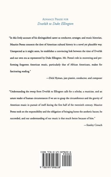In From Dvorak to Duke Ellington the prominent symphony conductor Maurice Peress describes his career and experiences with American music and musicians. Peress conducted the world premiere of Leonard Bernstein's Mass, worked with Duke Ellington on the Suite from Black Brown and Beige and Queenie Pie, and reconstructed and recreated historic American concerts at which Antheil's Ballet Mecanique, Gershwin's Rhapsody in Blue, and Ellington's Black, Brown, and Beige were first presented. Peress also revisits Dvorak's three year residency in 1892-95, the controversy that greeted his radical notion that composers turn to Negro music for inspiration, and the careers of his students who went on to teach Copeland, Gershwin, and Ellington.