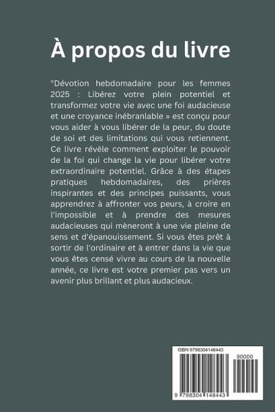 Vous êtes-vous déjà senti coincé dans l'ordinaire, alourdi par les peurs et les doutes, ne sachant pas comment vous libérer ? Et si la clé pour débloquer la vie extraordinaire dont vous rêvez se trouvait en vous et que tout commençait par un choix simple mais puissant: foi. Dans "Dévotion hebdomadaire pour les femmes 2025: Libérez votre plein potentiel et transformez votre vie avec une foi audacieuse et une croyance inébranlable, vous découvrirez comment vous libérer de vos croyances limitantes et prendre des mesures audacieuses vers la vie que vous êtes vraiment censé vivre. Ce livre transformateur s'adresse à tous ceux qui se sont déjà sentis désespérés, comme s'ils étaient destinés à vivre une vie de médiocrité - ou pire encore, à ceux qui sont aux prises avec le poids écrasant des pensées suicidaires. Dans ces pages, vous trouverez des étapes pratiques, des histoires réelles inspirantes et une plongée profonde dans le pouvoir transformateur d'une foi dangereuse. Le genre de foi qui ose croire à l'impossible. Le genre de foi qui peut guérir ceux qui sont brisés, restaurer l'espoir et transformer l'ordinaire en extraordinaire. Voici ce que vous apprendrez: * Comment changer votre état d'esprit de la peur à la foi * Comment affronter vos peurs et prendre des décisions audacieuses qui changeront votre vie * Les outils pour exploiter votre force intérieure et créer la vie que vous méritez * Des principes puissants qui allumeront un nouveau feu en vous et réveilleront votre potentiel illimité Imaginer une vie où chaque revers devient un tremplin. Une vie où aucun rêve n'est trop grand et aucun obstacle n'est insurmontable. Que vous soyez aux prises avec un manque de but, des pensées de désespoir ou que vous cherchiez simplement à vivre une vie qui va bien au-delà de votre réalité actuelle, ce livre vous aidera à accéder à votre grandeur. Il ne s'agit pas seulement de croire, il s'agit faire. Votre vie extraordinaire vous attend. Êtes-vous prêt à le débloquer ? Faites un pas de foi aujourd'hui. Le voyage commence maintenant.