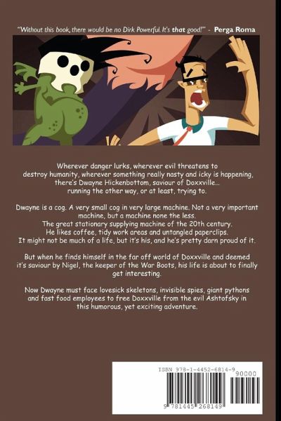 Wherever danger lurks, wherever evil threatens to destroy humanity, wherever something really nasty and icky is happening, there's Dwayne Hickenbottom, saviour of Doxxville... running the other way, or at least, trying to. Dwayne is a cog. A very small cog in very large machine. Not a very important machine, but a machine none the less. The great stationary supplying machine of the 20th century. He likes coffee, tidy work areas and untangled paperclips. It might not be much of a life, but it's his, and he's pretty darn proud of it. But when he finds himself in the far off world of Doxxville and deemed it's saviour by Nigel, the keeper of the War Boots, his life is about to finally get interesting. Now Dwayne must face lovesick skeletons, invisible spies, giant pythons and fast food employees to free Doxxville from the evil Ashtofsky in this humorous, yet exciting adventure. Dwayne Hickenbottom and the War Boots of Doxxville.
