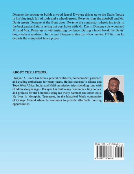 Dwayne the contractor builds a wood fence! Dwayne drives up to the Davis' house in his blue truck full of tools and a wheelbarrow. Dwayne rings the doorbell and Mr. Davis greets Dwayne at the front door. Dwayne the contractor wheels his tools to the backyard and starts laying out post holes with Mr. Davis. Dwayne cuts wood and Mr. and Mrs. Davis assist with installing the fence. During a lunch break, the Davis' dog sneaks a sandwich. In the end, Dwayne states just show me and I'll fix it as he departs the completed fence project.