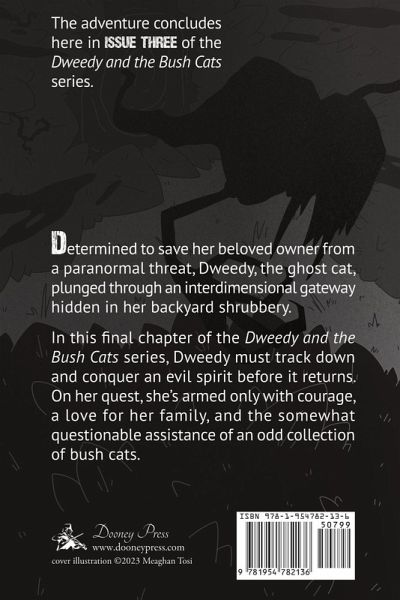 "If you've had a beloved pet pass away, this book is dedicated to them. I hope they're having some wild ghostly adventures." -Author & Illustrator Meaghan Tosi Determined to save her beloved owner from a paranormal threat, Dweedy, the ghost cat, plunged through an interdimensional gateway hidden in her backyard shrubbery. In this final chapter of the Dweedy and the Bush Cats series, Dweedy must track down and conquer an evil spirit before it returns. On her quest, she's armed only with courage, a love for her family, and the somewhat questionable assistance of an odd collection of bush cats.