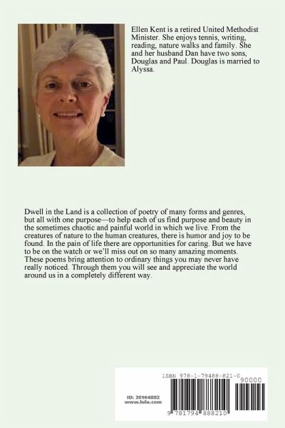 Dwell in the Land is a collection of poetry of many forms and genres, but all with one purpose Ñ to help each of us find purpose and beauty in the often chaotic and painful world in which we live. From the creatures of nature to the human creatures, there is humor and joy to be found. In the pain of life there are opportunities for caring. But we have to be on the watch or weÕll miss out on so many amazing moments. These poems bring attention to ordinary things you may never have really noticed. Through these poems you will see and appreciate the world around us in a completely different way.