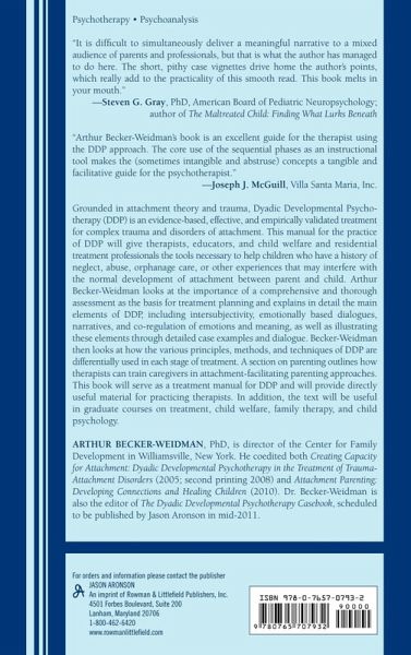 Grounded in attachment theory and trauma, Dyadic Developmental Psychotherapy (DDP) is an evidence-based, effective, and empirically validated treatment for complex trauma and disorders of attachment. This manual for the practice of DDP will give therapists, educators, and child welfare and residential treatment professionals the tools necessary to help children who have a history of neglect, abuse, orphanage care, or other experiences that may interfere with the normal development of attachment between parent and child. Becker-Weidman looks at the importance of a comprehensive and thorough assessment as the basis for treatment planning and explains in detail the main elements of DDP, including intersubjectivity, emotionally based dialogues, narratives, and co-regulation of emotions and meaning, as well as illustrating these elements through detailed case examples and dialogue. Dr. Becker-Weidman then looks at how the various principles, methods, and techniques of DDP are differentially used in each stage of treatment. A section on parenting outlines how therapists can train caregivers in attachment-facilitating parenting approaches. This book will serve as a treatment manual for DDP and will provide directly useful material for practicing therapists. In addition, the text will be useful in graduate courses on treatment, child welfare, family therapy, and child psychology.