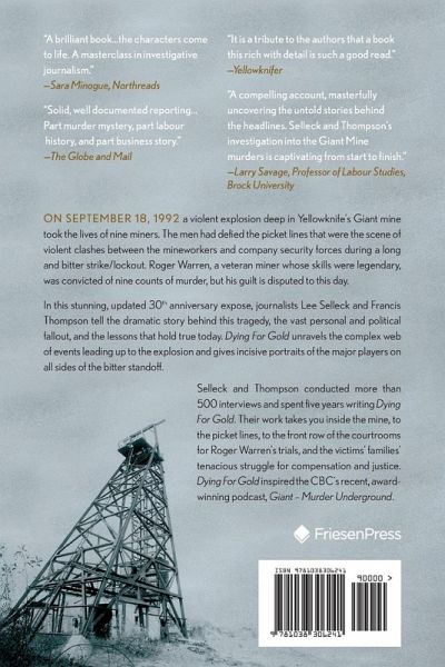 On September 18, 1992 a violent explosion deep in Yellowknife's Giant mine took the lives of nine miners. The men had defied the picket lines that were the scene of violent clashes between the mineworkers and company security forces during a long and bitter strike/lockout. Roger Warren, a veteran miner whose skills were legendary, was convicted of nine counts of murder, but his guilt is disputed to this day. In this stunning, updated 30th anniversary expose, journalists Lee Selleck and Francis Thompson tell the dramatic story behind this tragedy, the vast personal and political fallout, and the lessons that hold true today. Dying For Gold unravels the complex web of events leading up to the explosion and gives incisive portraits of the major players on all sides of the bitter standoff. Selleck and Thompson conducted more than 500 interviews and spent five years writing Dying For Gold. Their work takes you inside the mine, to the picket lines, to the front row of the courtrooms for Roger Warren's trials, and the victims' families' tenacious struggle for compensation and justice. Dying For Gold inspired the CBC's recent, award-winning podcast, Giant - Murder Underground.