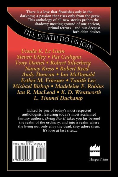 There is a love that flourishes only in the darkness; a passion that rises only from the grave. This anthology of all-new stories probes the shadowy meeting ground of our ancient, primal terrors -- and our deepest forbidden desires. Edited by one of today's most respected anthologists, featuring today's most acclaimed fantasy authors, Dying for It takes you far beyond the realm of the ordinary, and into a realm where the living not only envy the dead, they adore them. It's love at last rites.