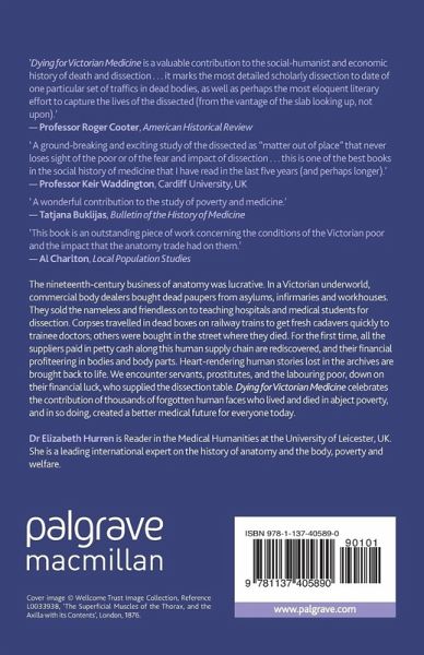 "The first book to provide a detailed analysis of the body-trafficking networks of the dead poor that underpinned the expansion of medical education from Victorian times. With an even-handed approach to the business of anatomy, Hurren uses remarkable case histories which still echo a vibrant body-business on the internet today in a biomedical age." - goodreads.com