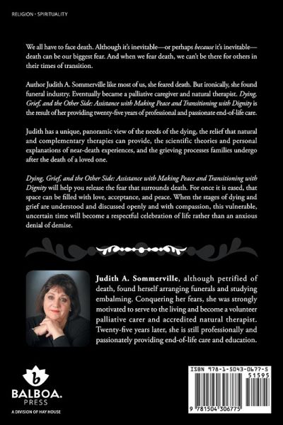 We all have to face death. Although it's inevitable-or perhaps because it's inevitable- death can be our biggest fear. And when we fear death, we can't be there for others in their times of transition. Author Judith A. Sommerville like most of us, she feared death. But ironically, she found funeral industry. Eventually became a palliative caregiver and natural therapist. Dying,Grief, and the Other Side: Assistance with Making Peace and Transitioning with Dignity is the result of her providing twenty-five years of professional and passionate end-of-life care. Judith has a unique, panoramic view of the needs of the dying, the relief that natural and complementary therapies can provide, the scientific theories and personal explanations of near-death experiences, and the grieving processes families undergo after the death of a loved one. Dying, Grief, and the Other Side: Assistance with Making Peace and Transitioning with Dignity will help you release the fear that surrounds death. For once it is eased, that space can be filled with love, acceptance, and peace. When the stages of dying and grief are understood and discussed openly and with compassion, this vulnerable, uncertain time will become a respectful celebration of life rather than an anxious denial of demise.