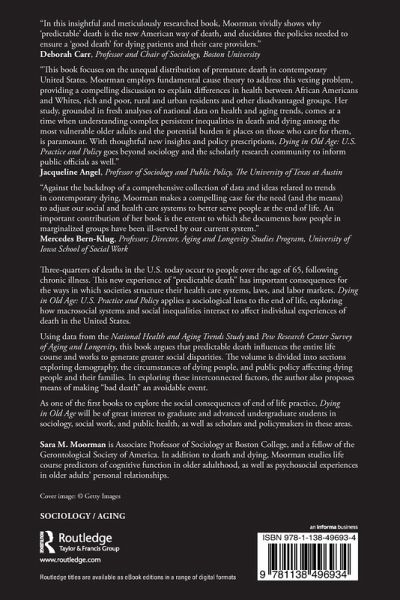 Three-quarters of deaths in the U.S. today occur to people over the age of 65, following chronic illness. This new experience of "predictable death" has important consequences for the ways in which societies structure their health care systems, laws, and labor markets. Dying in Old Age: U.S. Practice and Policy applies a sociological lens to the end of life, exploring how macrosocial systems and social inequalities interact to affect individual experiences of death in the United States. Using data from the National Health and Aging Trends Study and Pew Research Center Survey of Aging and Longevity, this book argues that predictable death influences the entire life course and works to generate greater social disparities. The volume is divided into sections exploring demography, the circumstances of dying people, and public policy affecting dying people and their families. In exploring these interconnected factors, the author also proposes means of making "bad death" an avoidable event. As one of the first books to explore the social consequences of end of life practice, Dying in Old Age will be of great interest to graduate and advanced undergraduate students in sociology, social work, and public health, as well as scholars and policymakers in these areas.