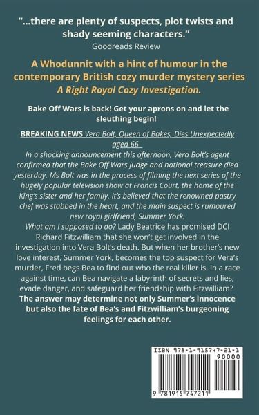 Bake Off Wars is back! Get your aprons on and let the sleuthing begin! BREAKING NEWS Vera Bolt, Queen of Bakes, dies unexpectedly aged 66 In a shocking announcement this afternoon, Vera Bolt's agent confirmed that the Bake Off Wars judge and national treasure died yesterday. Ms Bolt was in the process of filming the next series of the hugely popular television show at Francis Court, the home of the King's sister and her family. It's believed that the renowned pastry chef was stabbed in the heart, and the main suspect is rumoured new royal girlfriend, Summer York. What am I supposed to do? Lady Beatrice has promised DCI Richard Fitzwilliam that she won't get involved in the investigation into Vera Bolt's death. But when her brother's new love interest, Summer York, becomes the top suspect for Vera's murder, Fred begs Bea to find out who the real killer is. In a race against time, can Bea navigate a labyrinth of secrets and lies, evade danger, and safeguard her friendship with Fitzwilliam? The answer may determine not only Summer's innocence but also the fate of Bea's and Fitzwilliam's burgeoning feelings for each other.